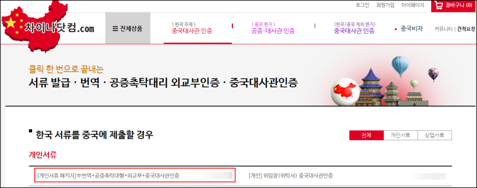 혼인관계증명서 서류를 지참하신 경우, [개인서류 패키지]中번역+공증촉탁대행+외교부+중국대사관인증 상품 클릭