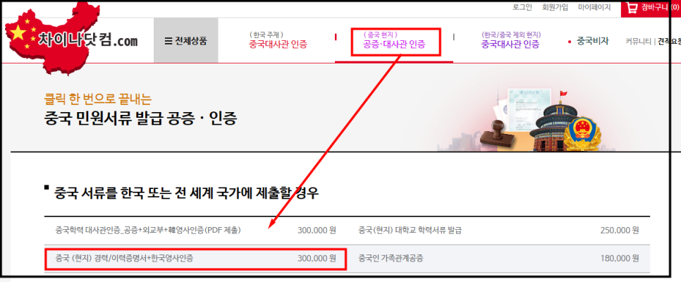 3. 해당 상품에서 중국(현지) 경력/이력증명서 한국영사인증 상품을 클릭합니다.