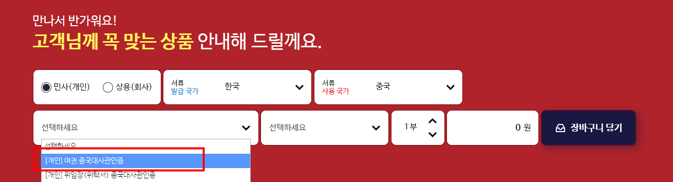홈페이지 하단 부분에서 [개인] 여권 중국대사관인증을
