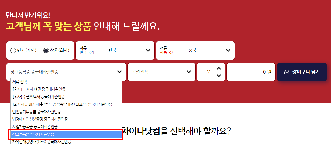 홈페이지 메인에서 [상용(회사)]서류 선택 후에, 상표등록증 중국대사관인증을 신청 후에,
