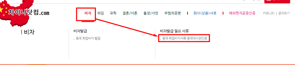홈페이지 상단의 비자 - 중국 취업비자서류 클릭!