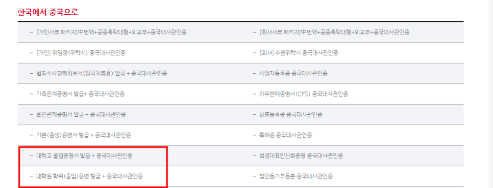 중국 현지에서 취업, 유학을 목적으로 학위증명서를 중국 기관에 제출하는 일이 있습니다. 학위증명서를 중국에 제출을 하려면 기본적으로 중국어번역, 공증, 외교부인증, 중국대사관 영사인증을 받아야 만 제출이 가능합니다. 국내 학위증명서는 학교마다 양식도 다르고 영문/국문 발급에 따라 내용도 달라지는 경우가 있습니다. 또, 번역부분이 누락되어서 중국대사관에 접수 시, 언제든지 거절 될 수 있습니다. 간혹 학위증명서에는 제출처를 넣어서 발급 받는 경우가 있는데 , 해당 부분을 중국현지제출기관이나 비자발급 용 등등으로 꼭 기입을 하여서 진행을 해야 합니다.